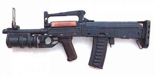 ОЦ-14 «Гроза» — штурмовой стрелково-гранатомётный комплекс, разработанный ЦКИБ СОО в 1989 году[3]. Представляет собой необычный вариант автомата АКС-74У, выполненный по схеме булл-пап. На него устанавливается несколько упрощённый вариант подствольного гранатомёта ГП-25 «Костёр» (упрощение прежде всего заключается в отсутствии пистолетной рукоятки). Такая компоновка позволила создать компактное мощное оружие. Автоматный и гранатомётный огонь управляются единым спусковым крючком. Переключение режима «автомат-гранатомёт» осуществляется кнопочным переводчиком, расположенным на правой стороне ствольной коробки. Прицел открытого типа размещён на П-образной стойке, которая может служить для переноски оружия в руке[4]. Предусмотрена возможность установки глушителя, лазерного целеуказателя, оптического прицела и тактического фонаря. Комплекс унифицирован с АКС-74У на 70 %, что позволяет взаимозаменять детали при ремонте.Компактность и сравнительно небольшая масса оружия, компоновка по схеме «булл-пап» обеспечила хороший баланс и уменьшила подскок ствола.